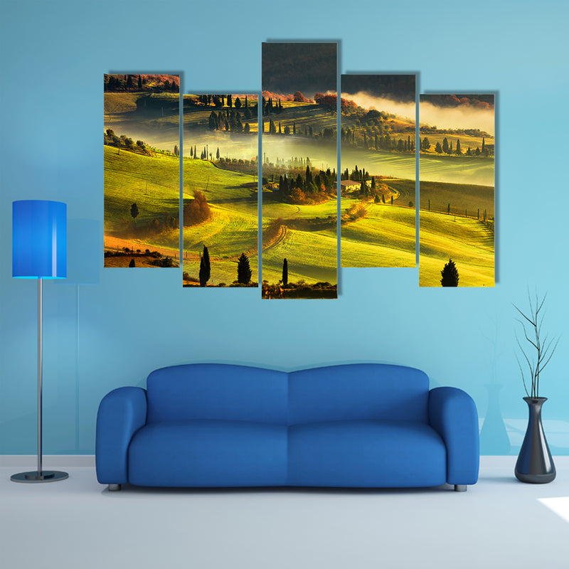 Tuscany foggy morning, farmland and cypress trees country landscape, Italy, Europe multi panel canvas wall art