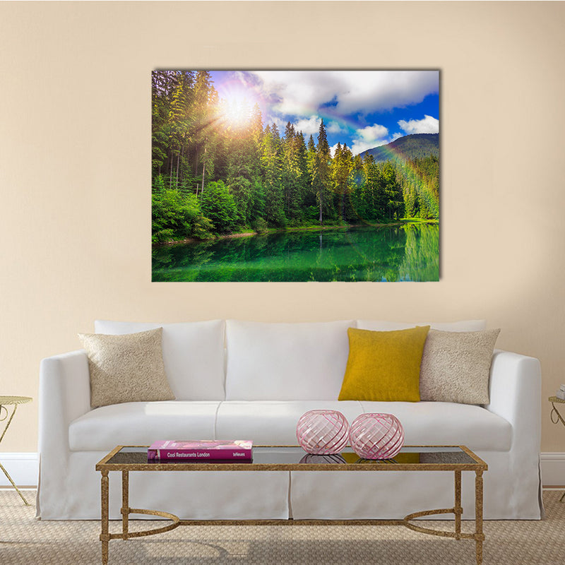 This is one of the most astonishing and cheerful canvas prints that you can enjoy. The elegance of this print is just wonderful and without any comparison. The tall green trees and the speaking beauty of the jungle has just made it a worthy canvas print. The blue sky is filled with the white fluffy clouds and the sky is making this print a best one for home décor, view on lake near the pine forest early in the morning on mountain background multi panel canvas wall art. There is a lake just in the mid of the jungle and its water is reflecting the trees. It is made by the clarnia.