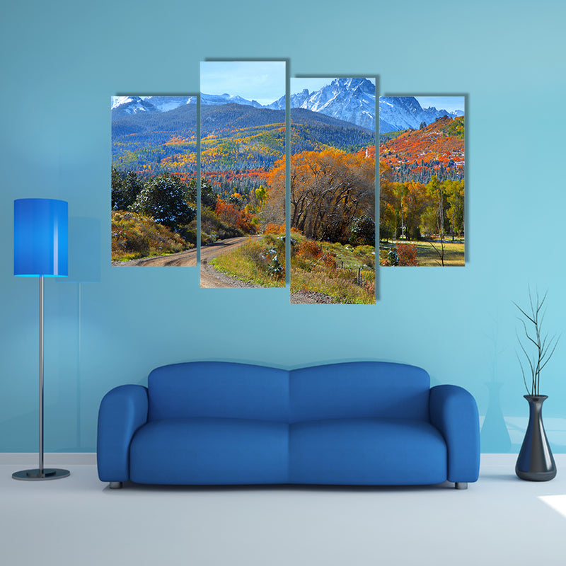 In this canvas print you can see the scenic back road near a Ridgeway in the Colorado. This cheap canvas print has been designed by the clarnia. There are mountains and a zigzag road has been moving through these mountains, Scenic back road near Ridgeway Colorado multi panel canvas wall art. The road has been covered by the orange and yellow leaf trees on its all sides. The season is spring and the leaves of the trees are fresh and spreading frangrance all around along with the clear weather.