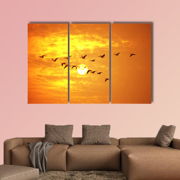 This large canvas print is portraying the beautiful view of flying birds against orange sunset. The backdrop of this print is giving the wide view of golden sky. In this print you can see the scattered clouds on the colorful sky. You can get this cheap canvas wall art set print from clarnia store.