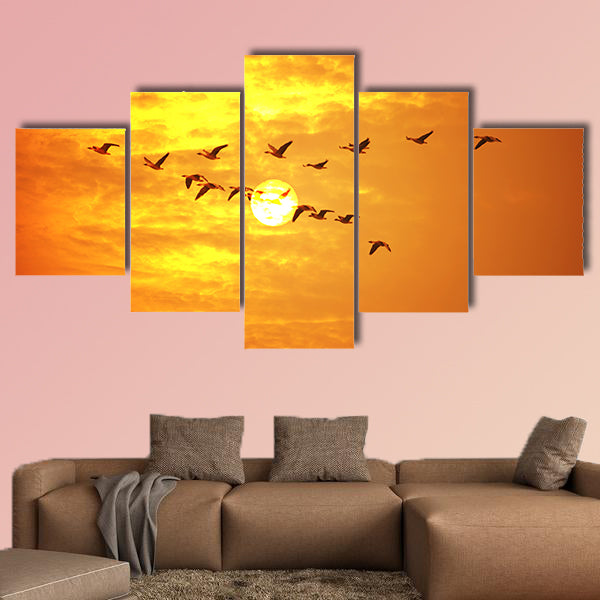 Flying birds against orange sunset Multi panel canvas wall art