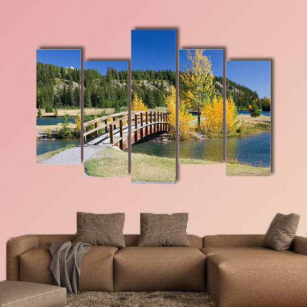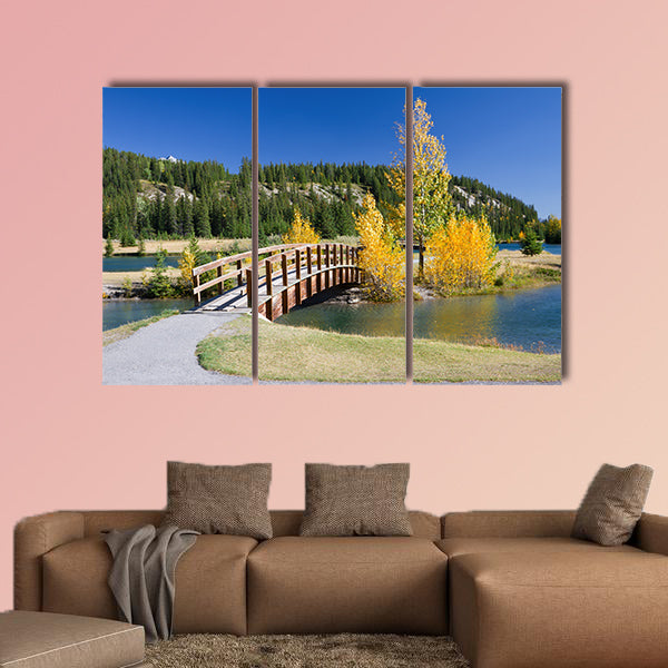 In this large canvas print you can see the beauty of the autumn in Banff National Park, Alberta, Canada Beautiful landscape with yellow trees and wooden bridge across the river. This cheap canvas print can be used for home and office décor as well. The bridge is made of wood and it has increased the beauty of the canvas print. This cheap canvas print has been designed by the Clarnia store that is an online canvas making store.
