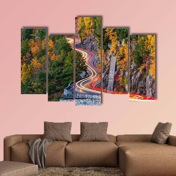 In this large canvas print you can see the traffic light trails on Hawk's Nest winding road route 97 in Upstate New York, on an autumn evening. This cheap and versatile canvas print can be used for home and office décor as well. This cheap canvas print has been designed by the Clarnia store that is a canvas making store. The whole environment is looking bizarre due to the heavy traffic load.