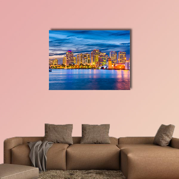 This is the West Palm Beach in the Florida, USA downtown skyline on the waterway. The sparkling beauty of the skyline on the beach is beyond the description of the words. This outstanding cheap canvas print can be used for home and office décor as well. It is designed by the clarnia store and there are large scale buildings that have been illuminated under the sunset. The waterway on the beach is astonishing.