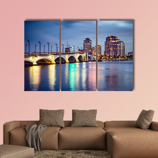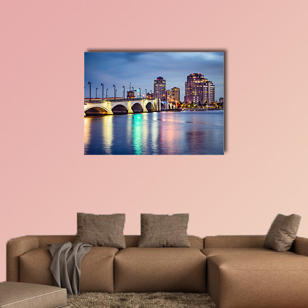 This is the West Palm Beach in the Florida, USA downtown skyline on the waterway. The sparkling beauty of the skyline on the beach is beyond the description of the words. This outstanding cheap canvas print can be used for home and office décor as well. It is designed by the clarnia store and there are large scale buildings that have been illuminated under the sunset. The waterway on the beach is astonishing.
