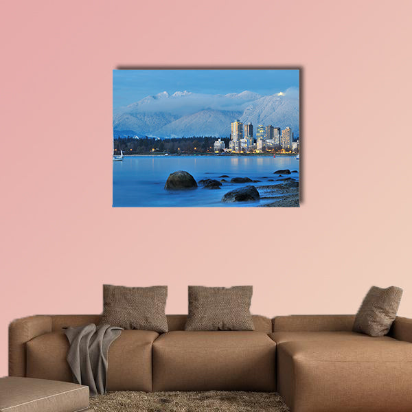 This cheap canvas print is illustrating the fantastic view of Vancouver cityscape with Grouse Mountain. The backdrop of this print is giving the view of beautiful lush green trees with wide view of beach and small rocks on the shore. In this print you can see the amazing view of boat in the Centre of the beach. This large canvas wall art set print is available in clarnia store.