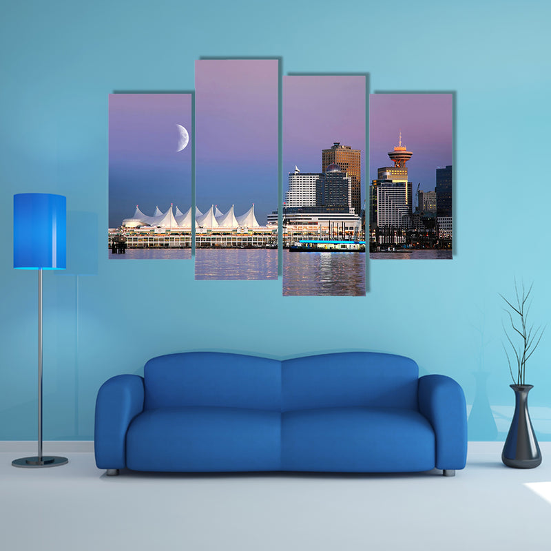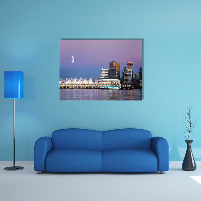 A beautiful waterfront at the Canada place in the Vancouver in BC has been illustrated in this cheap canvas print. The whole atmosphere is purple and the sky is shinning with the moon. You can see white moon and clouds in the canvas print that has been designed by the clarnia store, Waterfront at Canada Place, Vancouver, BC, Canada multi panel canvas wall art. The cheap canvas print can be used for home and office décor because the buildings that you can see in this canvas print are just without any comparison.