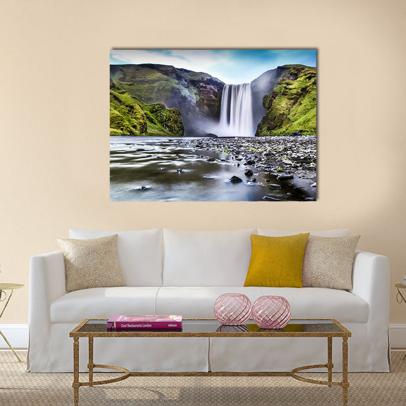 This large and cheap canvas print is illustrating the view of famous Skogafoss waterfall in Iceland at dusk multi panel canvas wall art The backdrop is black with yellow, red, orange and burnt orange combination of lava. You can get this famous Skogafoss waterfall in Iceland at dusk canvas wall art from Clarnia store for office and home décor.