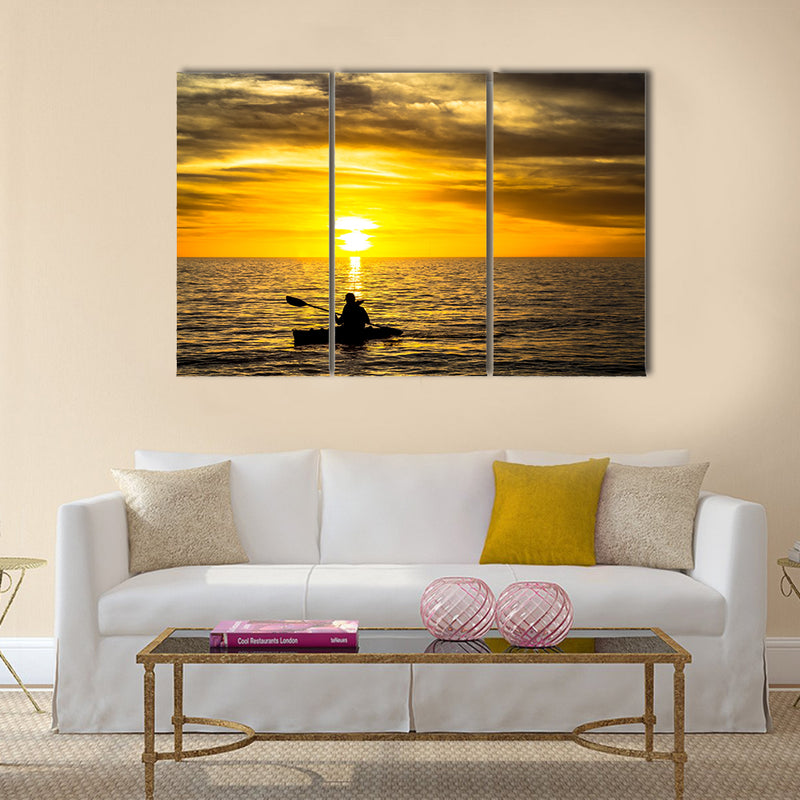 This large cheap print is portraying the Fisherman in the kayak on the ocean Multi panel canvas wall art The backdrop of this print is giving the lush view of kayaking in the river. In this print you can see the Fisherman in the kayak on the ocean canvas wall art This place is amazing for tourism. You can easily bought this canvas wall art set print from clarnia store for your home and office decor.