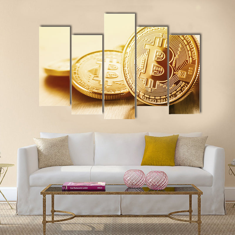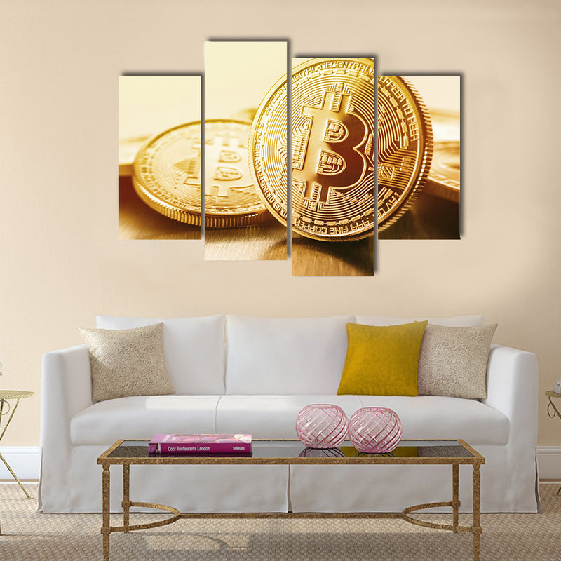 This large and cheap canvas print is illustrating the concept of Golden  bitcoin multi panel canvas wall art  The color combination is unique and different Golden  bitcoins canvas wall art  This wall art set is available at Clarnia store for home and office décor.