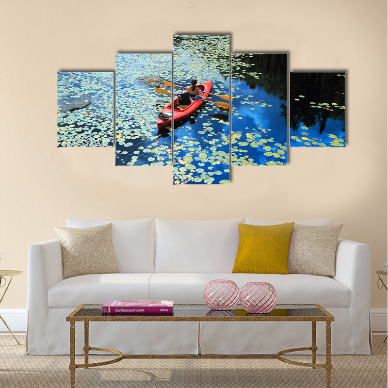 This large cheap print is portraying the High angle view of the people canoeing Multi panel canvas wall art The backdrop of this print is giving the lush view of kayaking in the river. In this print you can see the High angle view of the people canoeing canvas wall art This place is amazing for tourism. You can easily bought this canvas wall art set print from clarnia store for your home and office decor.