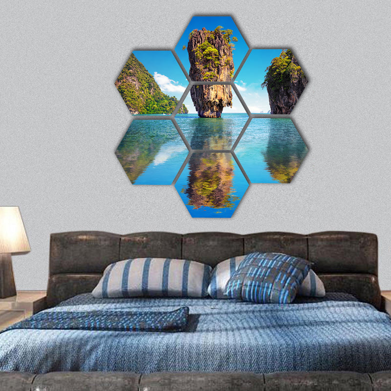 James Bond island reflects in water near Phuket hexagonal canvas wall art