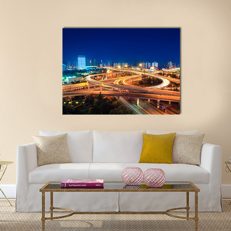 The modern city highway overpass at night multi panel canvas wall art which city has been presented in this large canvas print. modern city highway overpass at night canvas wall art cheap canvas print can be used for home and office décor as well. This cheap canvas print has been designed by the Clarnia store that is a canvas making store. The bridge is clear and strong crossing the mountains.