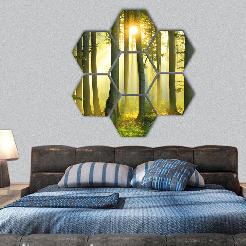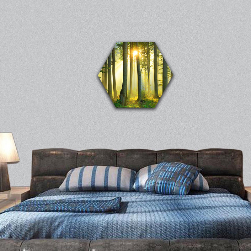 Clarnia is a concept store and your one stop solution for adding class to the interiors. Here you go with the most surreal Morning in the forest hexagonal canvas wall art collection. We specialize in Morning in the forest with perfect animation of designs and colors with bold strokes and hues. Every tint is going to melt your heart. Our paneled wall art collection is here to get you bundle of compliments.