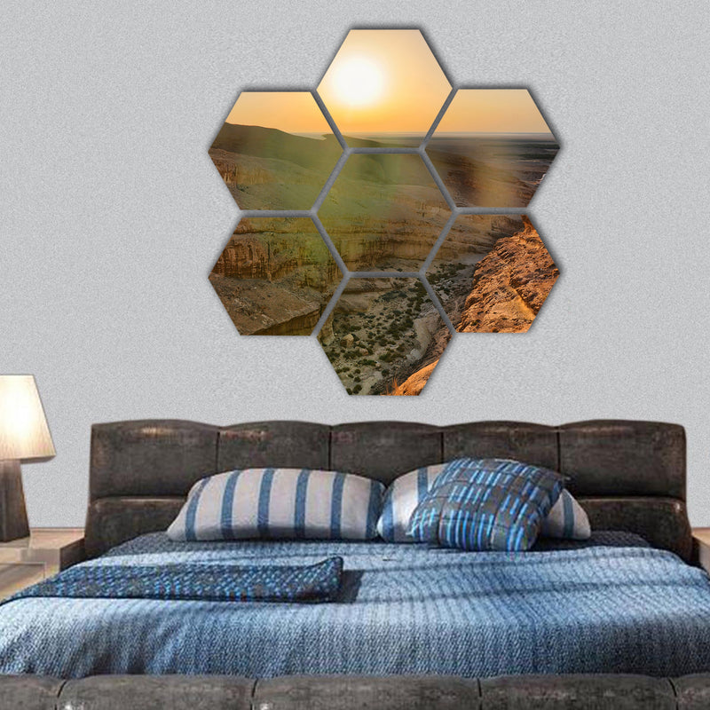 Sunrise above Star Wars canyon, Sahara desert, hexagonal canvas wall art