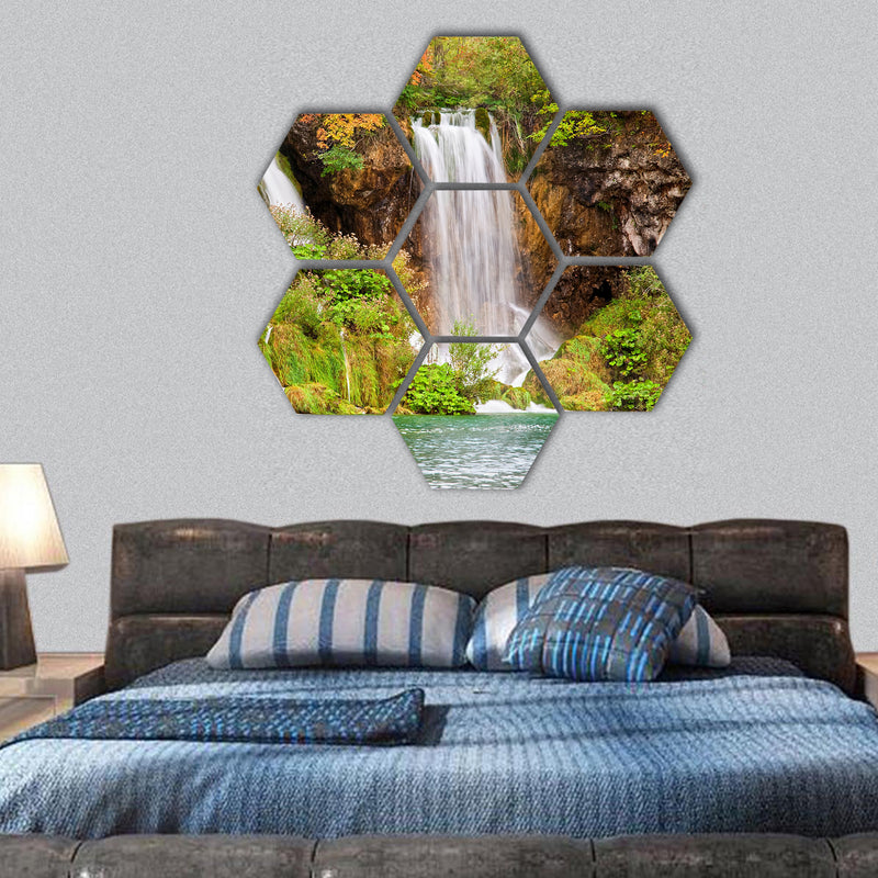 waterfalls in a picturesque autumn of the Plitvice Lakes hexagonal canvas wall art