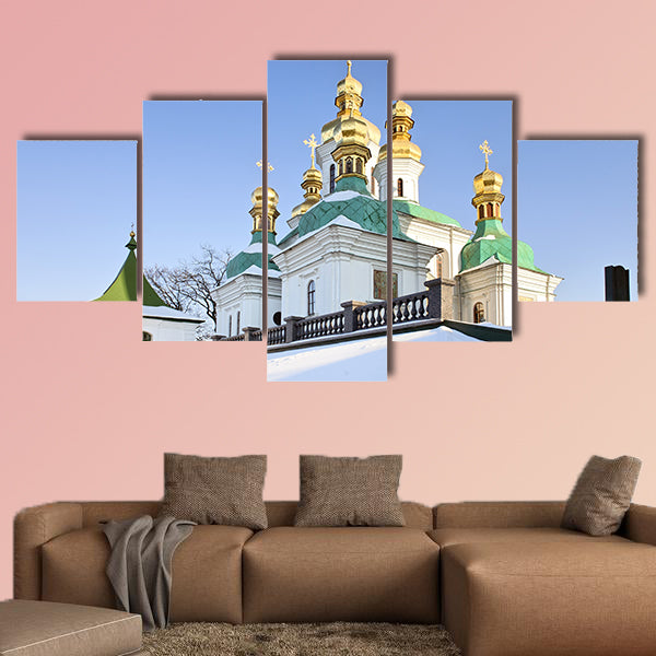 This is the beauty of the golden domes and a roof of the church of Nativity of the Holy Virgin in snow at Kiev Pechersk Lavra Orthodox monastery, Kiev in Ukraine. This cheap canvas print can be used for home and office décor as well. This cheap canvas print has been designed by the Clarnia store that is a canvas making store. The domes are representing the old architecture of the cityscape.