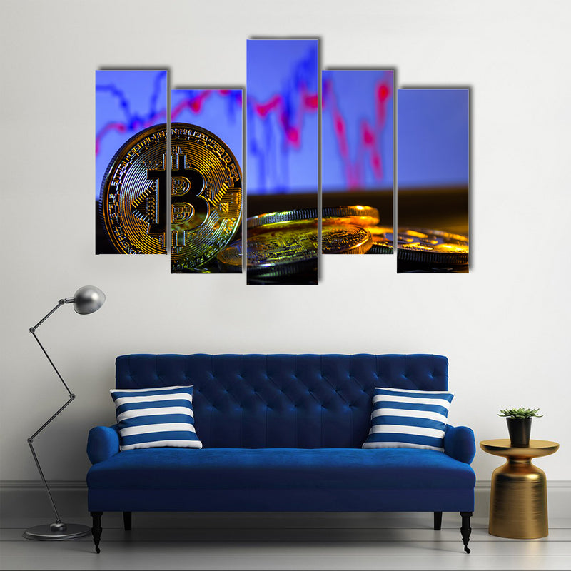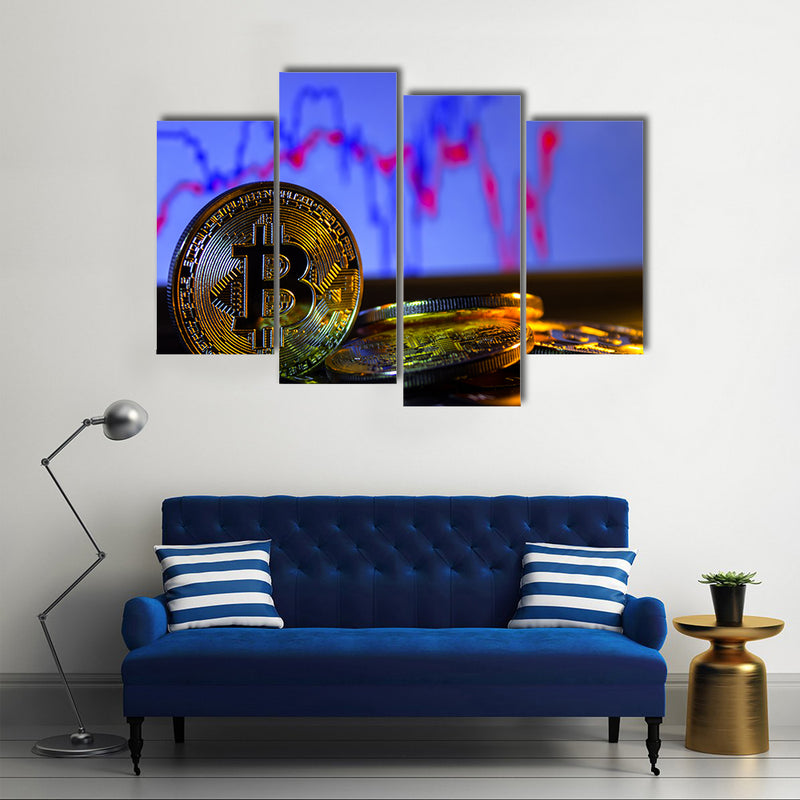 This wall art set is illustrating the trading concept of bitcoins. A golden bitcoin with keyboard and graph background is portrayed in this large canvas print. This is the trading concept of crypto currency, A golden bitcoin with keyboard and graph background multi panel canvas wall art. The graph background in blue and red is quite unique and you can buy this cheap canvas print from Clarnia store for office and home décor.