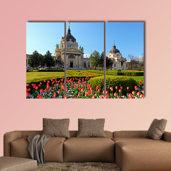 This is the beauty of the Szechenyi Spa with flower in the Budapest in Hungary. The big white building is the symbol of beauty of the city. This cheap canvas print can be used for home and office décor as well. This cheap canvas print has been designed by the Clarnia store that is a canvas making store. There are white fluffy skies hanging in the space and making it an elegant print.