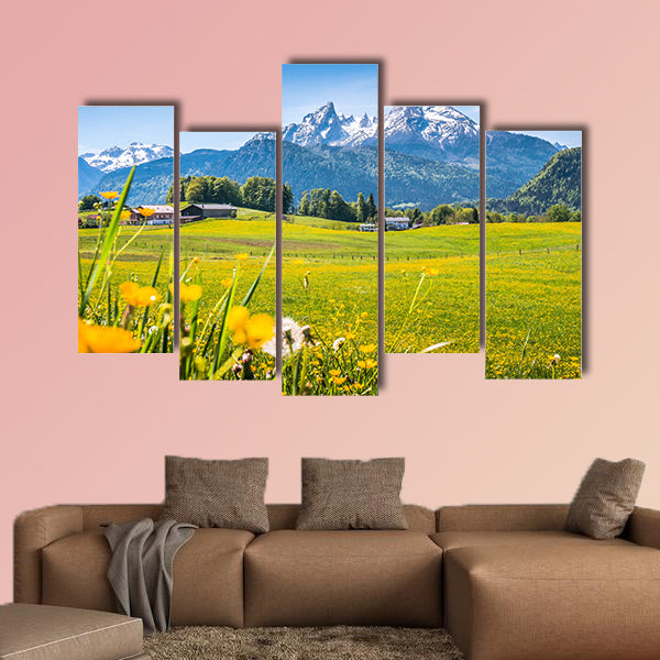 In this large canvas print you can enjoy the beauty of the Idyllic landscape in the Alps. This cheap canvas print has been designed by the Clarnia store that is a canvas making store. It beauty along with the fresh green meadows, blooming flowers, typical farmhouses and snowcapped mountain tops in the background, Nationalpark Berchtesgadener Land, Bavaria, Germany is charming.