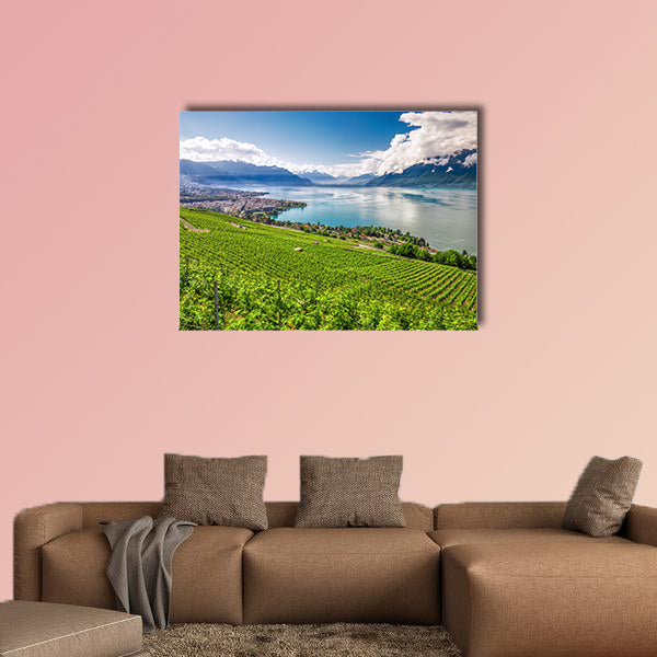 As the name of this large canvas print indicates, this is the beauty of the Panorama view of Montreux city with Swiss Alps, Lake Geneva and vineyard on Lavaux region, Canton Vaud, Switzerland, Europe. This cheap canvas print can be used for home and office décor as well. This cheap canvas print has been designed by the Clarnia store that is a canvas making store.