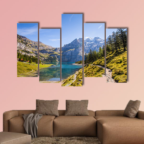 This is the elegant view of the Oeschinensee Lake. In this large canvas print you can see the beauty of the panorama of the Oeschinen Lake in Swiss Alps along with the summer view over the Oeschinensee (Oeschinen Lake). This cheap and versatile canvas print can be used for home and office décor as well. This cheap canvas print has been designed by the Clarnia store that is a canvas making store.