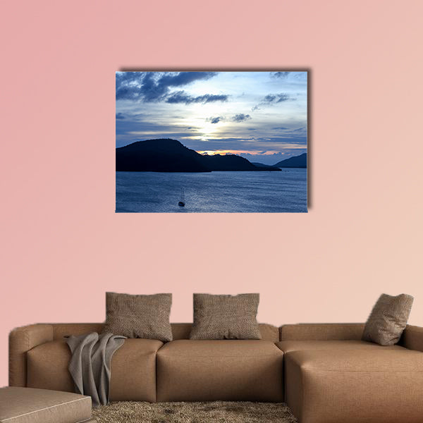 This large canvas print is portraying the stunning view of twilight of the sunset over the sea. The backdrop of this print is giving the fantastic wide view of sea and boats in it. In this print you can see the beautiful view of romantic evening and high mountains covered with trees in the background. The cloudy weather can also be seen. You can be bought this cheap canvas wall art set print from clarnia store.