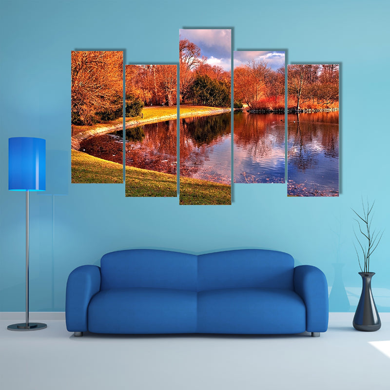 There is a pond in the park in this cheap canvas print. There is pond in the park that is surrounded by the trees and plants. The water in the pond is clean and is shinning under the sun. The atmosphere is clear under the sunny day. The sunlight is creating a shine in the plants and leaves of the trees, Beautiful Pond in the park multi panel canvas wall art. This print can be used to make your home beautiful and elegant. This canvas print has been designed by the clarnia store.