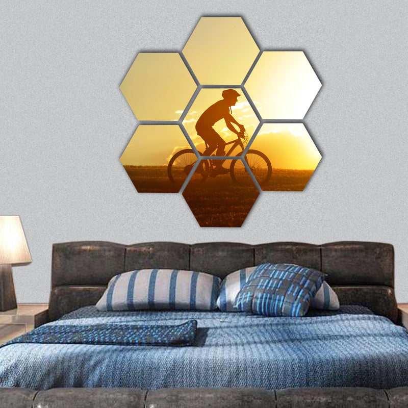 silhouette of sport man cycling uphill riding hexagonal canvas wall art