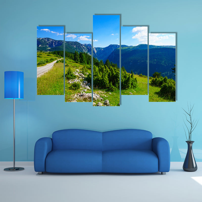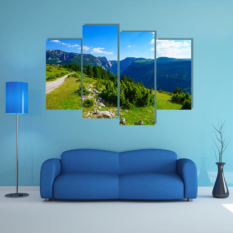 The landscape view and the Susica River Canyon, in Durmitor National Park in the Northern Montenegro in Nepal have been shown in this cheap canvas print by the clarnia store. The big and green mountains are touching the clouds and the whole environment is fantastic, Landscape view and the Susica River Canyon, in Northern Montenegro multi panel canvas wall art. The curved land has made the pathway hampering for visitors. The hilly area that has been presented in this cheap canvas print is very beautiful. There are two series of the mountains.