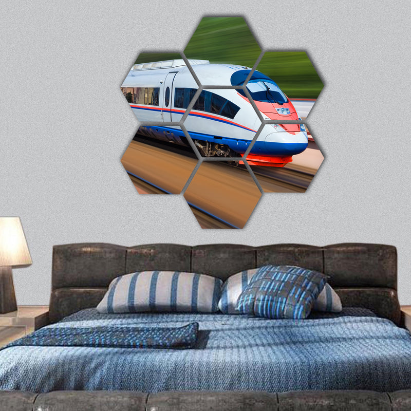 high speed modern commuter train, motion blur hexagonal canvas wall art