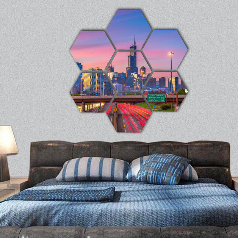 USA downtown skyline over highways at twilight hexagonal canvas wall art