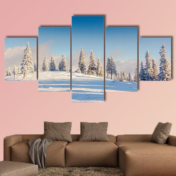 This large canvas print is portraying the fantastic view of winter landscape. The backdrop of this print is giving the beautiful view of blue sky Carpathian, Ukraine, Europe. In this print you can see the beautiful pine trees covered with snow. You can be bought this cheap canvas wall art set print from clarnia store.