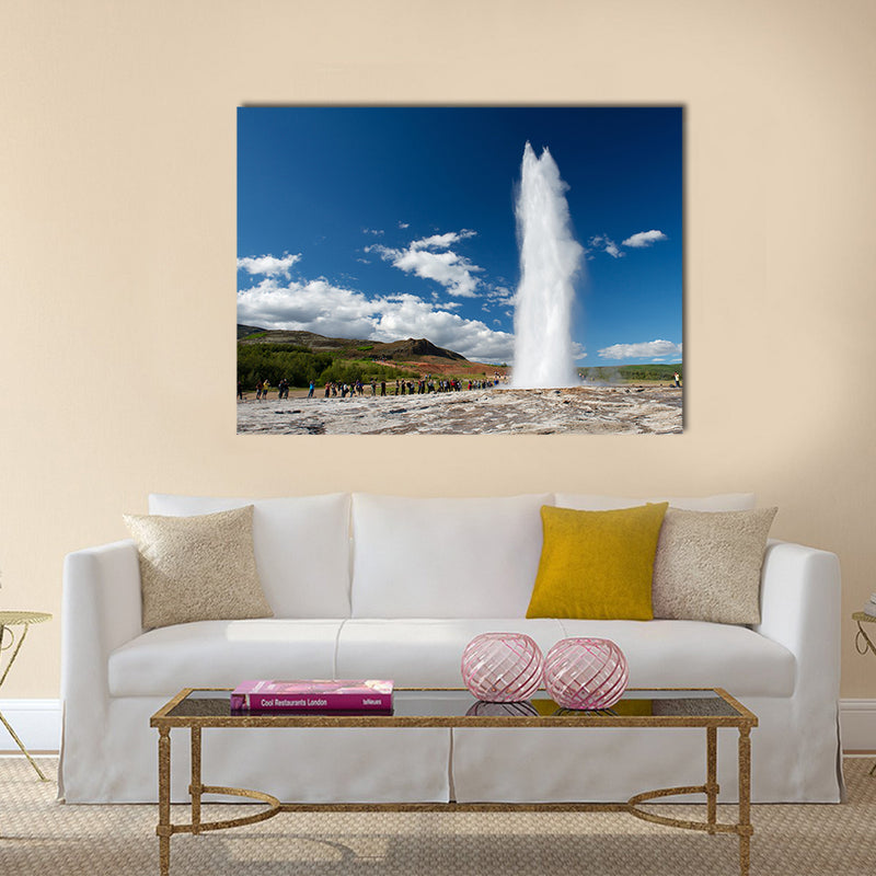 As the name of the large canvas print indicates, this is the Impressive eruption of the biggest active geysir, Strokkur, with tourists waiting around, Golden circle, Iceland multi panel canvas wall art The beauty of the print lies in the tall mountains, clear weather and cool breeze. The whole atmosphere is bizarre and fantastic. This cheap canvas print has been designed by the Clarnia store that is a canvas making store. This cheap canvas print can be used for home and office décor as well.