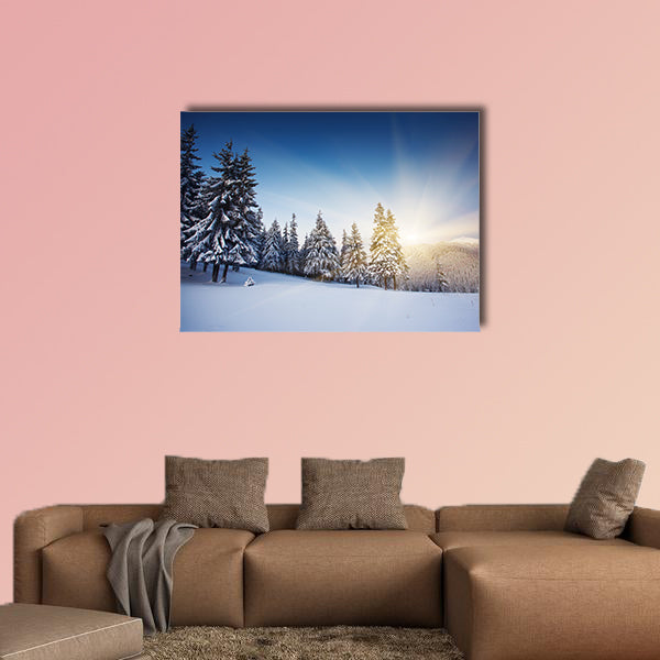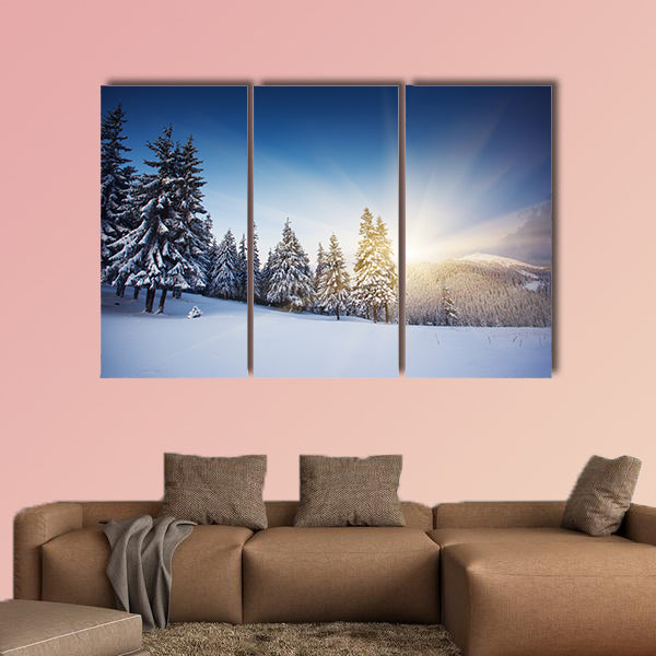 This large canvas print is illustrating the stunning winter background. The backdrop of this print is giving the wonderful view of snowfall and covered trees with snow. In this print you can see the amazing majestic sunset in the winter mountains landscape. This print is better for your home and office decoration and you can easily get this cheap wall art set print from clarnia store.