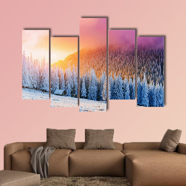 This large canvas print is portraying the stunning view of sunny winter landscape. The backdrop of this print is giving the fantastic view of pine trees covered with snow. In this print you can see the colorful clouds on the sky. You can be bought this cheap canvas wall art set print from clarnia store.
