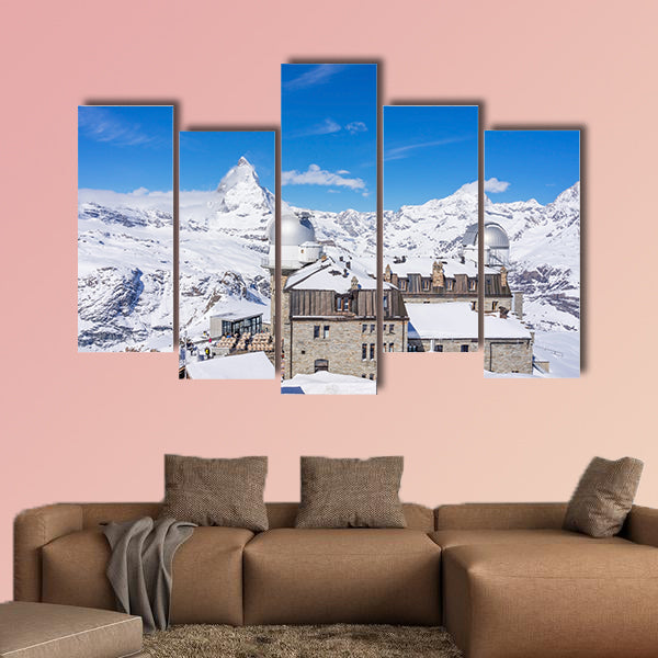 The observatory on Gornergrat Summit overlooking Matterhorn as background in Zermatt, an iconic emblem of the Swiss Alps in canton Valais, Switzerland have been presented in this large canvas print. This cheap and versatile canvas print can be used for home and office décor as well. This cheap canvas print has been designed by the Clarnia store that is a canvas making store.