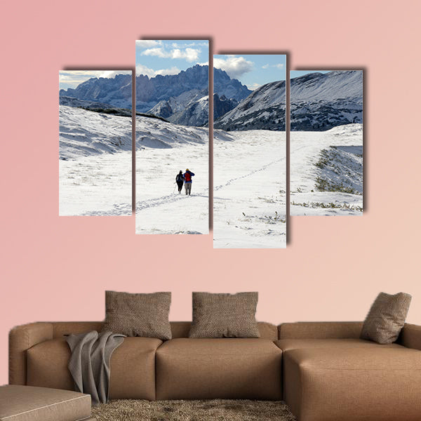 This large and cheap canvas print is portraying the fantastic view of landscape of dolomites covered with first snow. The backdrop of this print is giving the view of beautiful high mountains covered with snow. In this print you can see the beautiful view of snowy weather and people are walking on the snowy path. You can easily get this canvas wall art print from clarnia store.