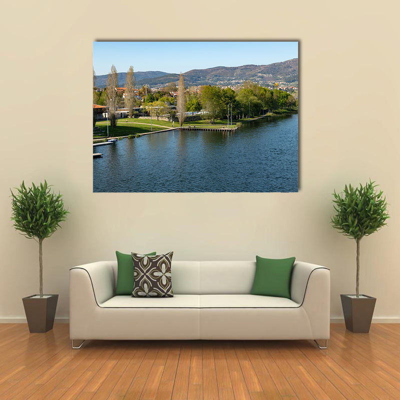 This large canvas print wall art set is illustrating the aerial view of beautiful and graceful stream. This canvas was taken at PONTE DE LIMA, PORTUGAL CIRCA on APRIL 2018, Aerial view of Nautical Club near Rio Lima in Ponte de Lima multi panel canvas wall art. This is the aerial view of Nautical Club near Rio Lima in Ponte de Lima. The stream is quite large with mountains in the backdrop. This cheap canvas print can be bought from Clarnia store for office and home décor.