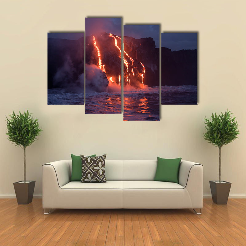 Hot lava streams are quite dangerous however they render the most beautiful and mesmerizing views when hot red lave is popping out of the cannons. In this large and cheap canvas print wall art set the hot lava stream is flowing into the ocean, Hot lava stream is flowing into the ocean. Hawaii, Big Island multi panel canvas wall art. This canvas is illustrating the lava stream of Hawaii, Big Island, This wall art set can be bought from Clarnia store for office and home décor.