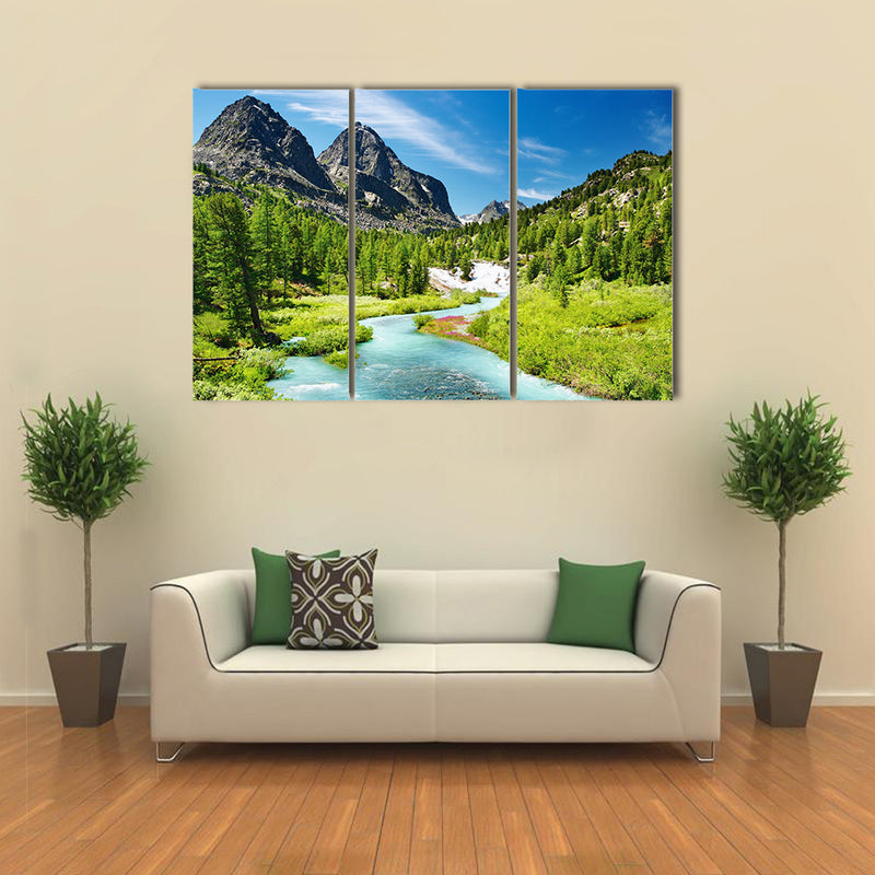 This large canvas print is illustrating the beautiful and scenic landscape of the mountains and the river. This is the mountain landscape with river and forest. The river is flowing between the forest and mountains in the backdrop. The sun is shining bright and illuminating the whole scenery, Mountain landscape with river and forest multi panel canvas wall art. You can buy this cheap canvas print wall art set from Clarnia store for office and home décor.
