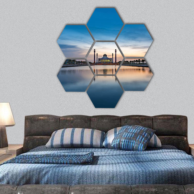 Central mosque in Songkhla with colorful sky hexagonal canvas wall art