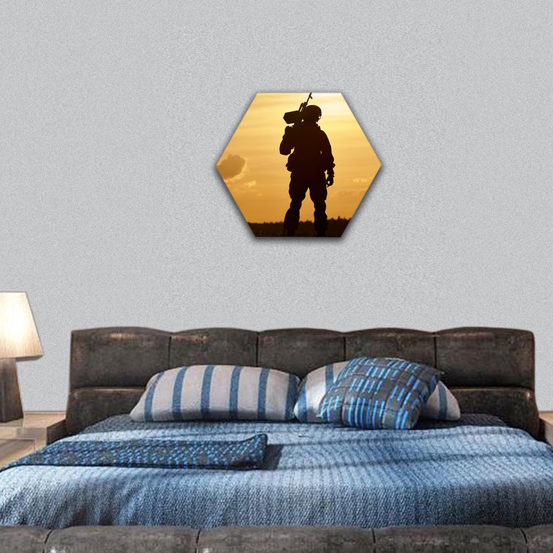 Clarnia is a concept store and your one stop solution for adding class to the interiors. Here you go with the most surreal Soldier silhouette in uniform with machine gun hexagonal canvas wall art collection. We specialize Soldier silhouette hexagonal canvas wall art making the perfect amalgamation of designs and colors with bold strokes and hues. Every tint is going to melt your heart. Our paneled wall art collection is here to get you bundle of compliments.