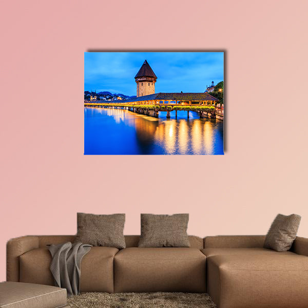 In this large canvas print you can see the historic city center with its famous Chapel Bridge at night with the Mt. Pilatus on the background. The bridge has been reflected in the clean water of the river. This cheap canvas print can be used for home and office décor as well. This cheap canvas print has been designed by the Clarnia store that is a canvas making store.
