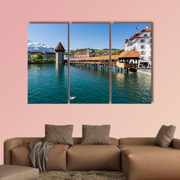 As the name of the large canvas print indicates, this is the scenic view of the Kapellbrucke, Chapel Bridge in Lucerne in spring, Switzerland. This cheap canvas print can be used for home and office décor as well. This cheap canvas print has been designed by the Clarnia store that is a canvas making store. The bridge is connecting the two opposite parts of the city.