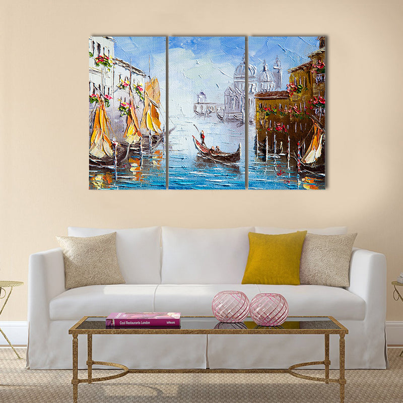 This large canvas print is a textured print which is illustrating the seaport view of the Vinec. This is illustrating the painting on canvas with oil paints, Painting on canvas painted with oil paints multi panel canvas wall art. The color combination is pastel and subtle with light colors outlined by black. The textured look is quite different. This cheap canvas print wall art set can be bought from Clarnia store for home and office décor.