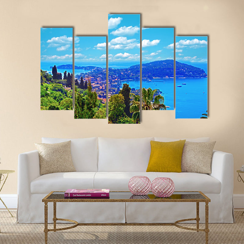 In this cheap canvas print you can see the beauty of the Cote d'Azur France. The view of luxury resort and bay of French Riviera is very impressive. A Villefranche-sur-Mer is situated between nice city and Monaco, A most beautiful view of Cote d'Azur France, multi panel canvas wall art. The Mediterranean Sea is one of the five biggest seas in the world. The print is looking very romantic because the mountains and trees are looking wonderful. The print can be used for home and office décor as well.