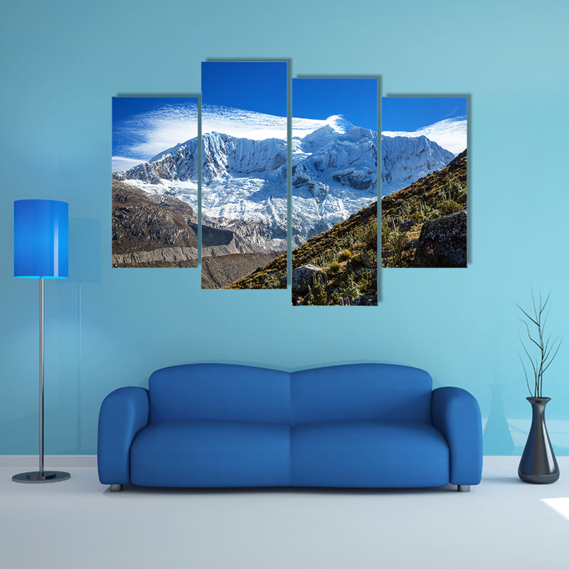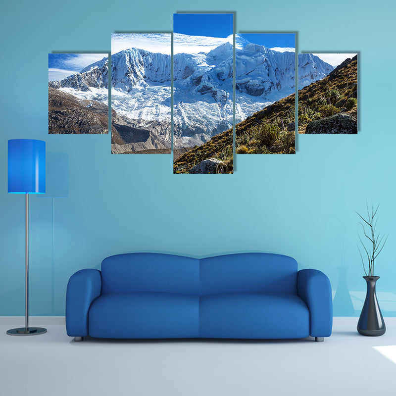 As the name of this cheap canvas print indicates, this is the landscapes in the Cordilla Huayhuash in the Peru in the United States of America. As it is clear from the print that there are two types of mountains, one is the green and the other is the white and both are located in front of each other, Beautiful mountains landscapes in Cordillera Huayhuash, Peru, South America Multi Panel Canvas Wall Art. The beautiful mountain landscapes are evident in this canvas print that shows the beauty of the weather.