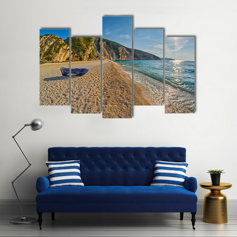 This large canvas print is illustrating an old beach with sunset. An old Abandoned Fishermen Boat is parked at the empty beach. The Sun is setting at the Myrtos Beach in Kefalonia, Greece. The beach is surrounded by green rocky bushes and sand is grayish brown, Old Abandoned Fishermen Boat at Empty Sunset Myrtos Beach in Kefalonia, Greece multi panel canvas wall art. The beach waves are in full motion and this cheap canvas print can be bought from Clarnia store for office and home décor.